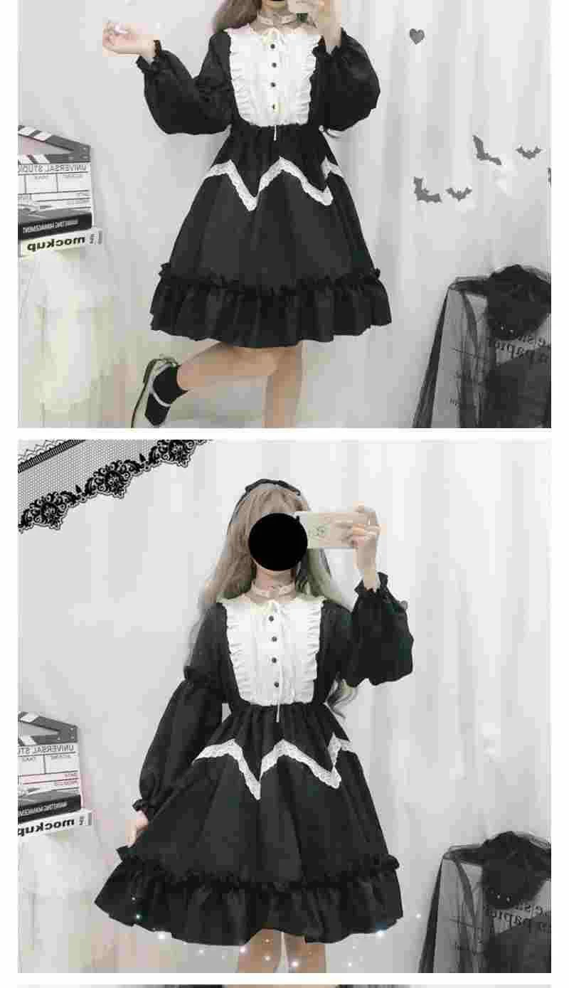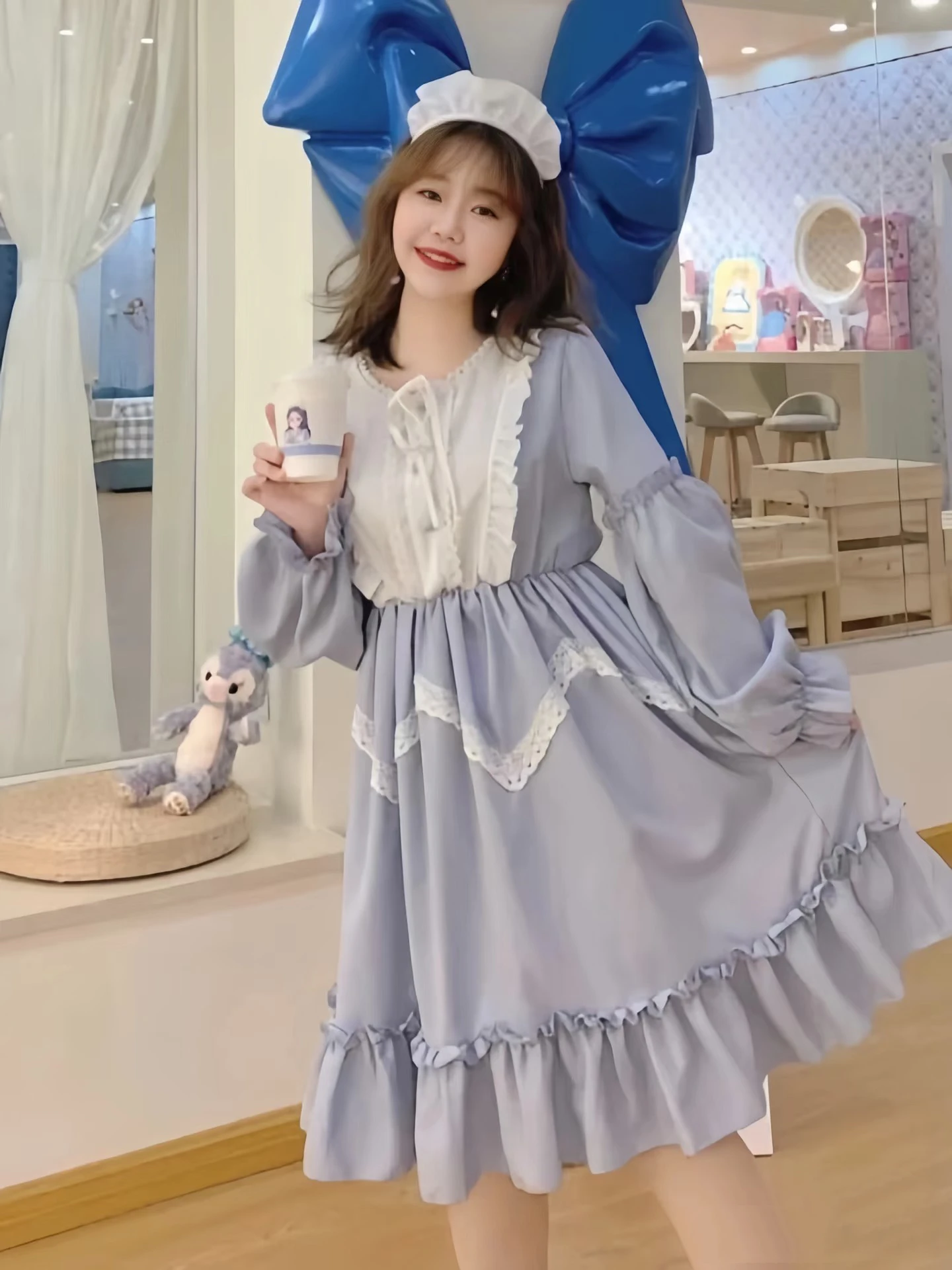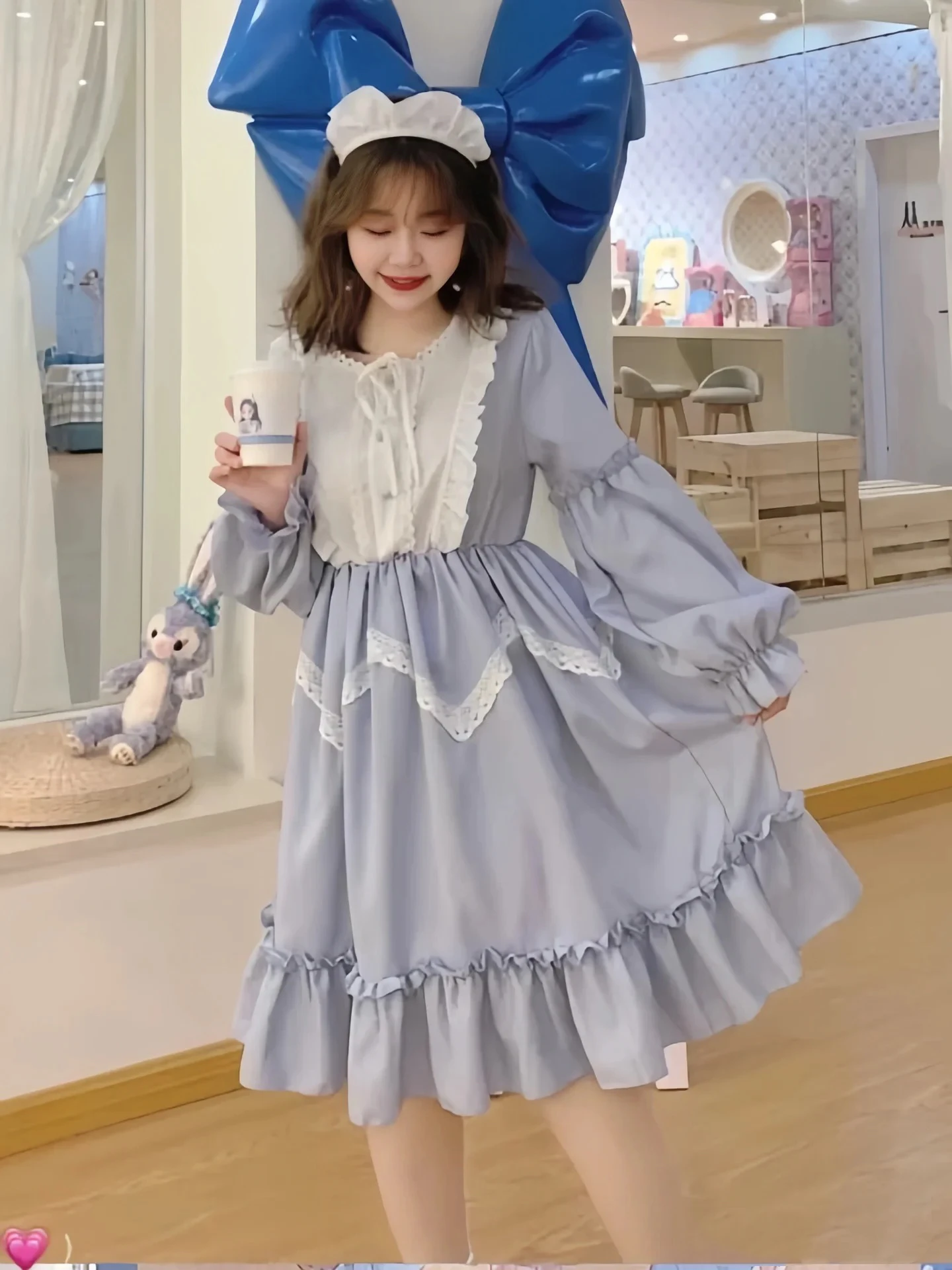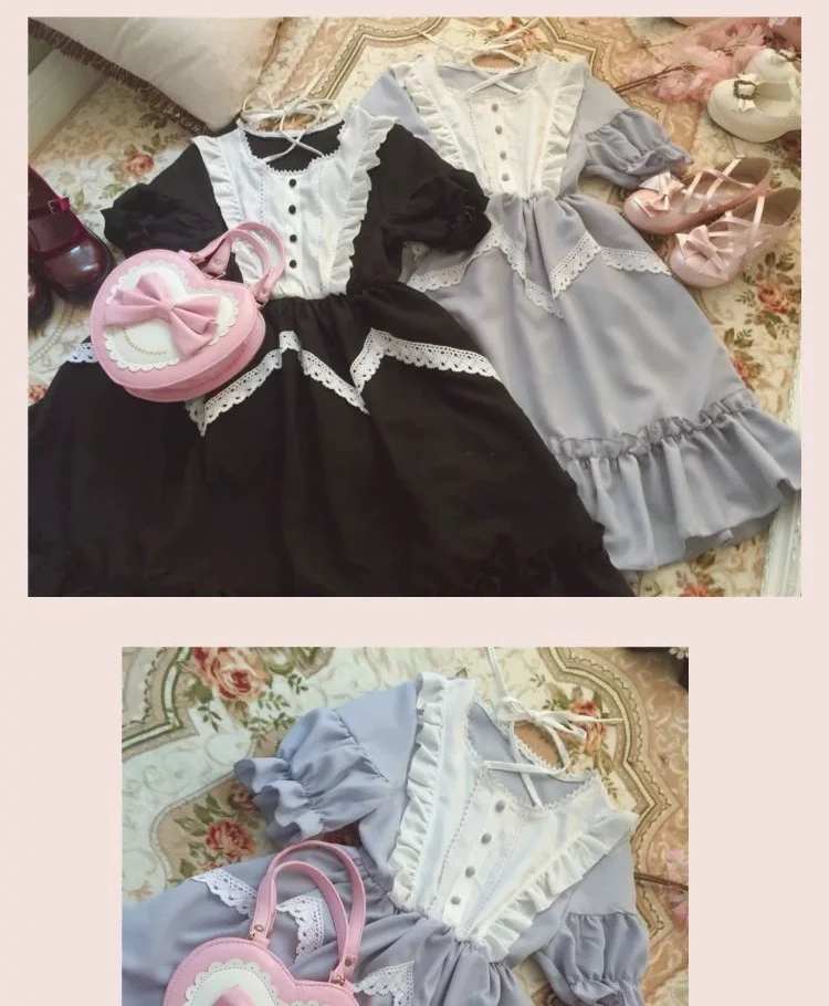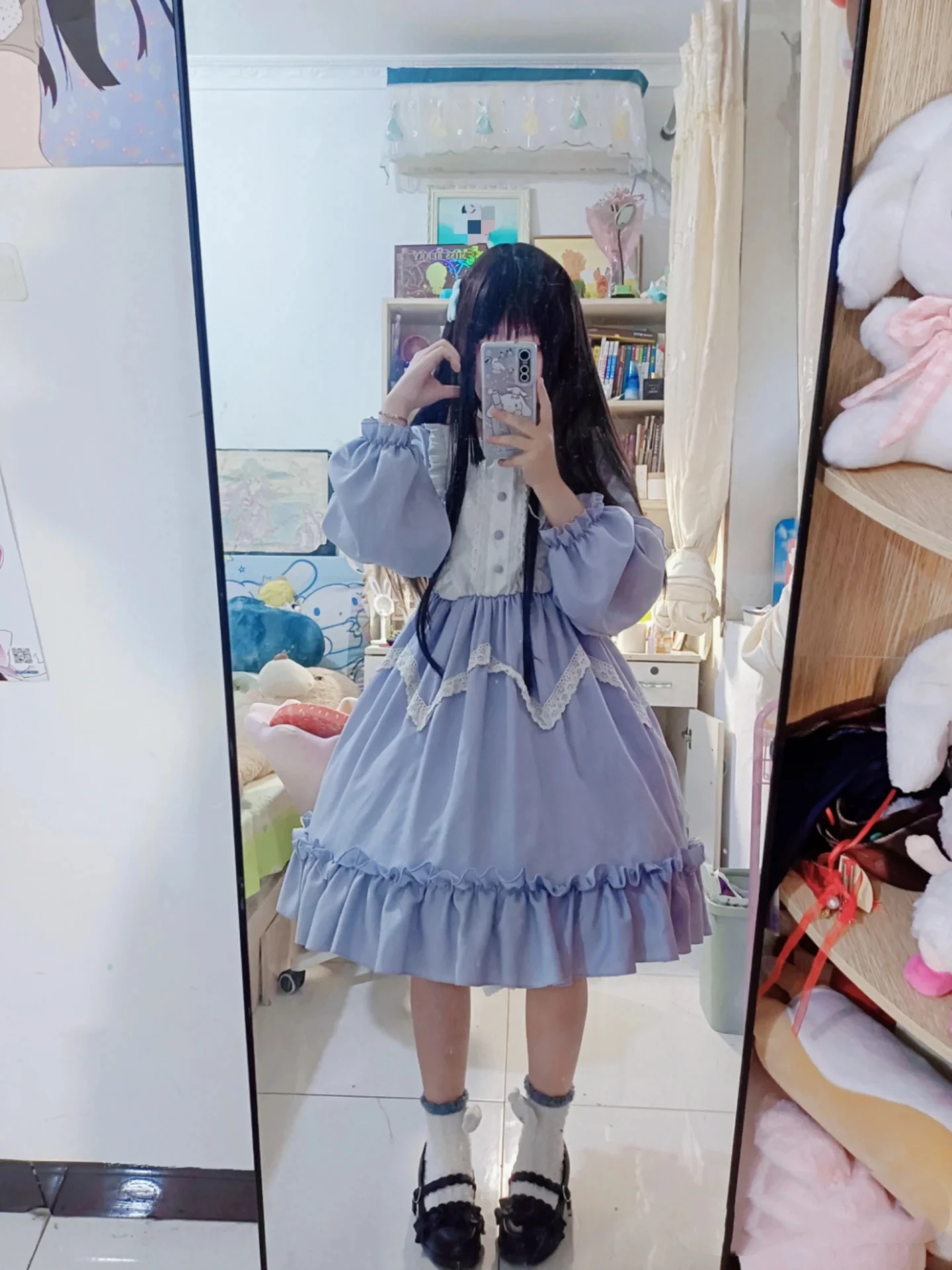 Japanese-Style girlish Lolita Cute Loose Daily Long-Sleeve/Short-Sleeve Spring-Summer Affordable Dress in Blue/Black
