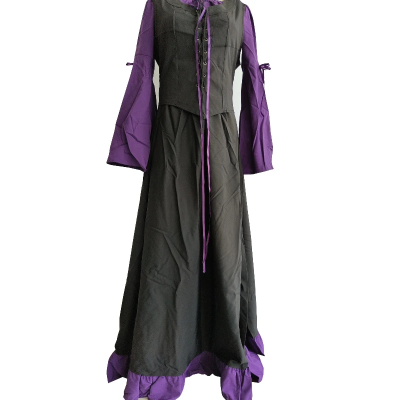 - Versatile Themed Gown Set: Available in multiple color combinations (brown/black, purple/black, blue/black, red/black), featuring a corset-style bodice, flowy maxi skirt, and decorative belt—ideal for medieval, gothic, or fantasy events.