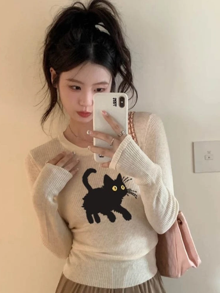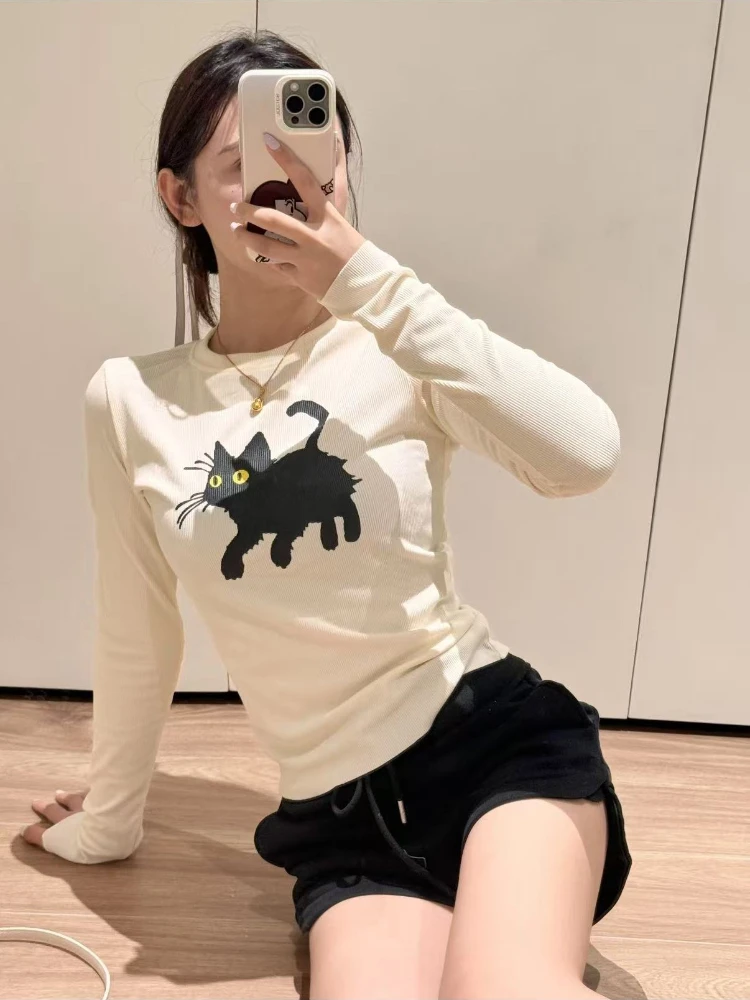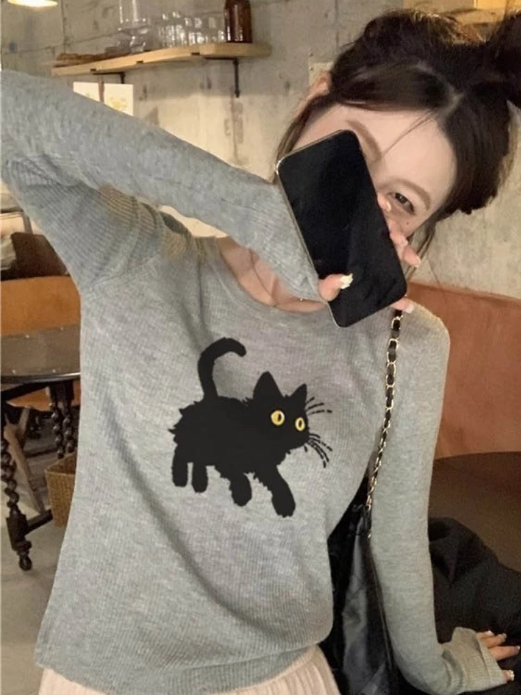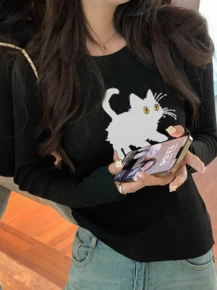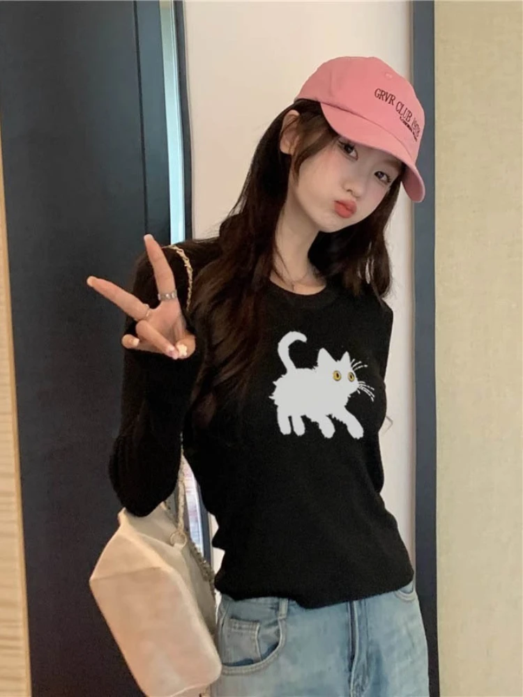 New Korean Fashion Kawaii Cat Print T-shirts Autumn Winter Sweet Pullover Women Y2k Aesthetic Al Match Harajuku Long Sleeve Tops