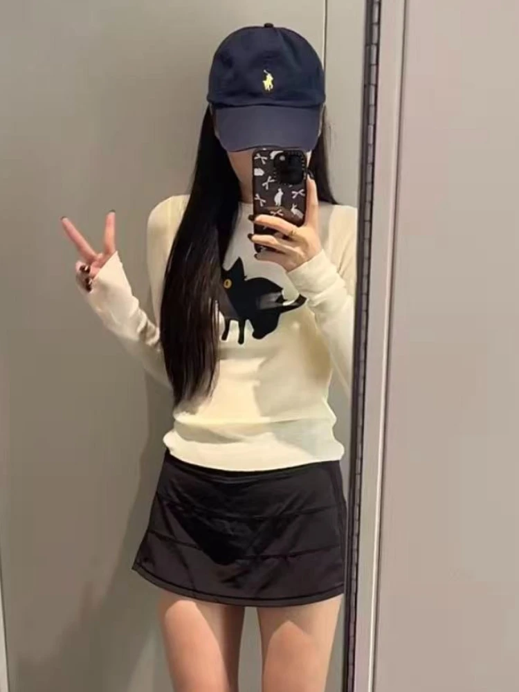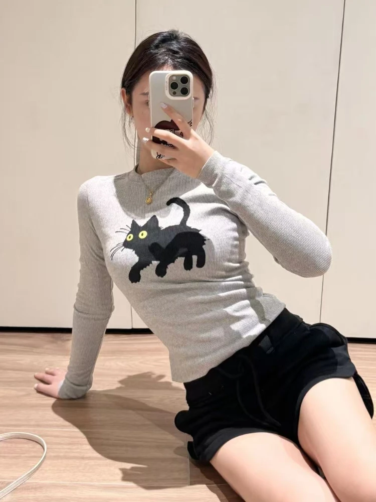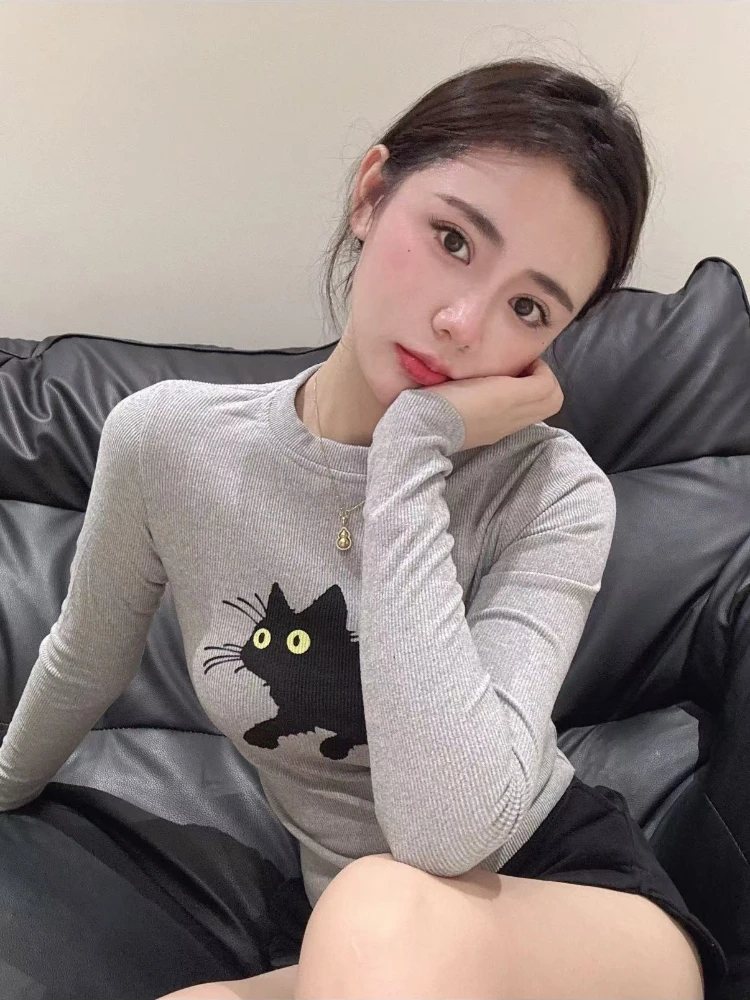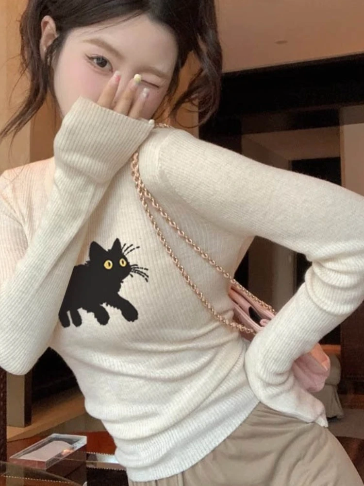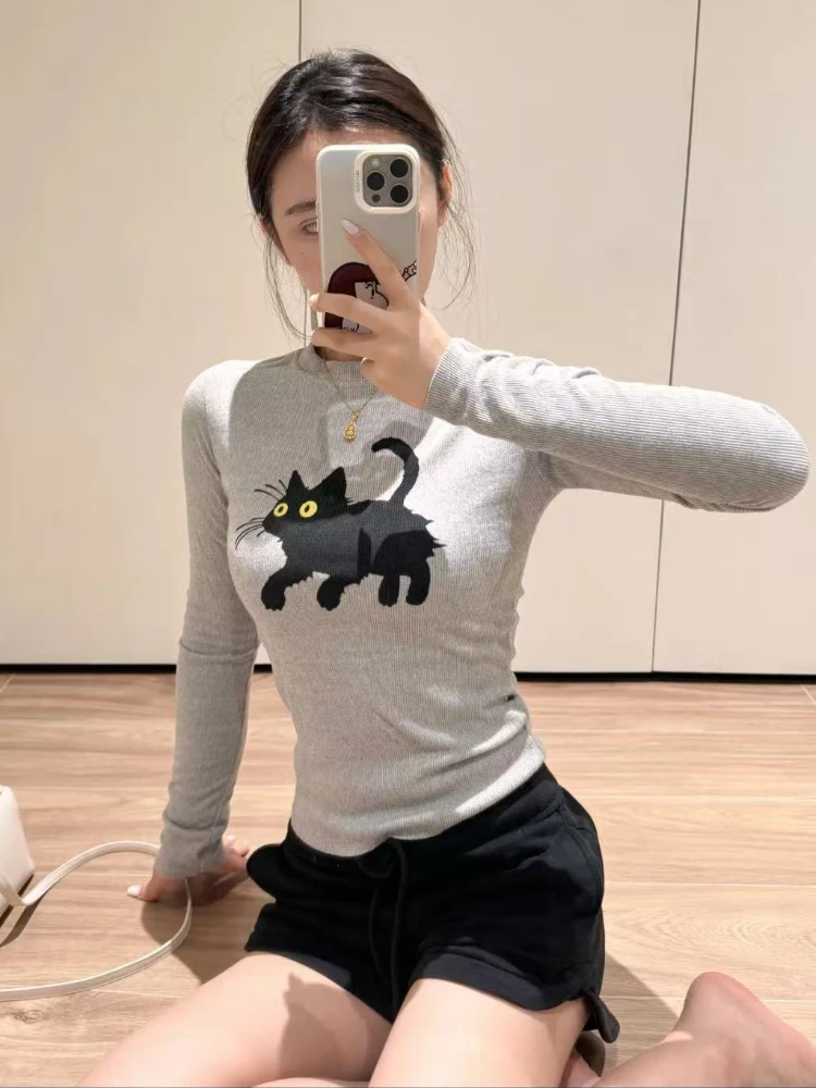 New Korean Fashion Kawaii Cat Print T-shirts Autumn Winter Sweet Pullover Women Y2k Aesthetic Al Match Harajuku Long Sleeve Tops