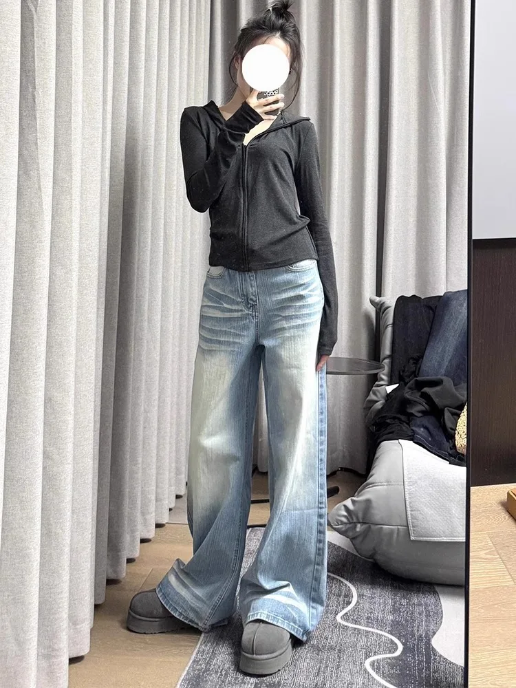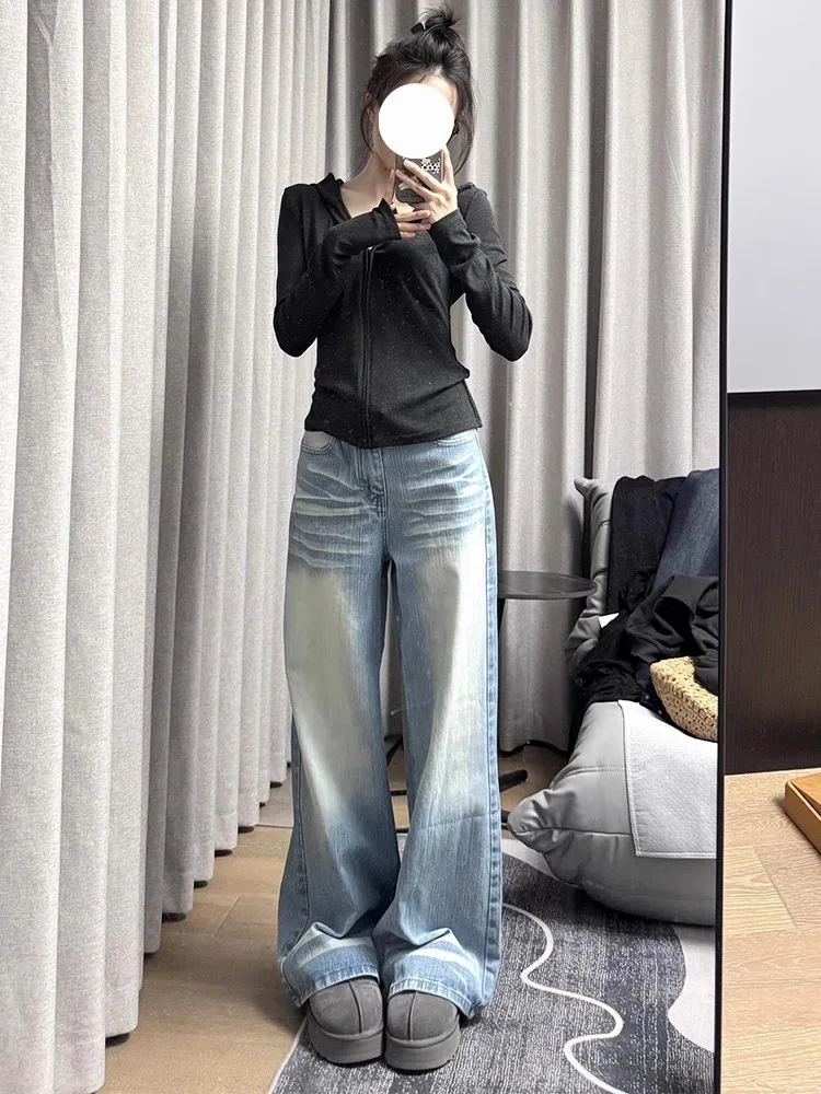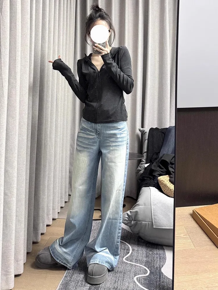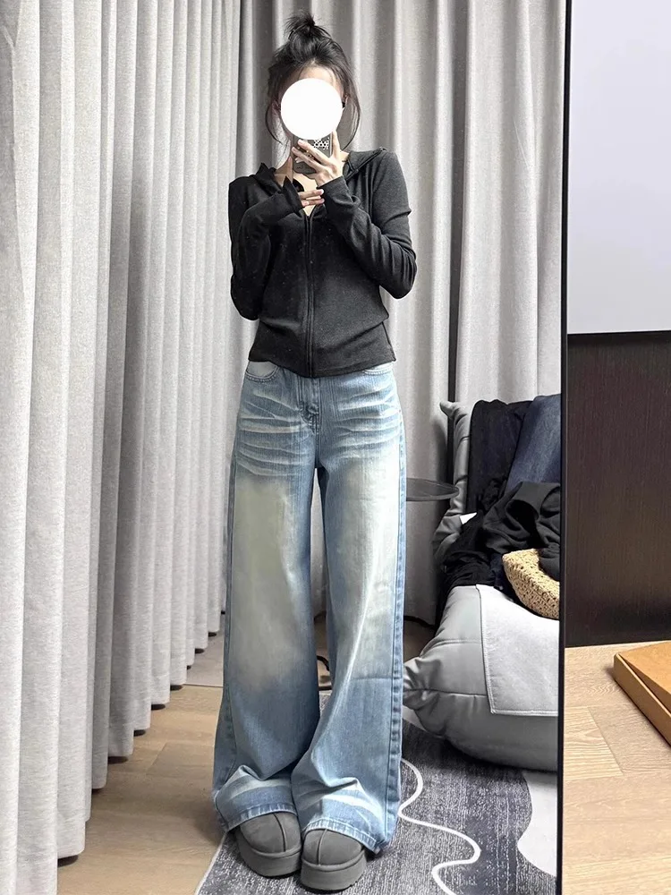 The wide-leg style of these jeans offers a comfortable, loose fit that drapes elegantly down to the floor, perfect for casual outings.