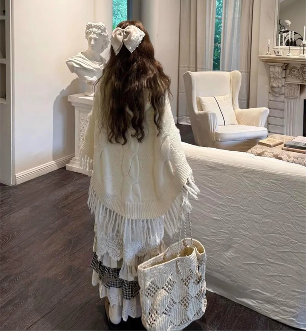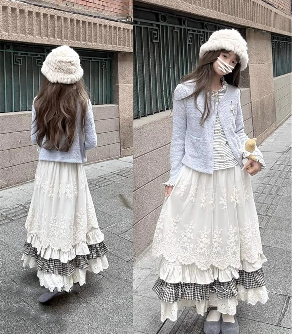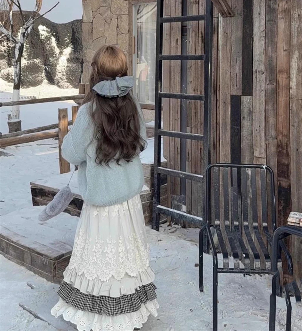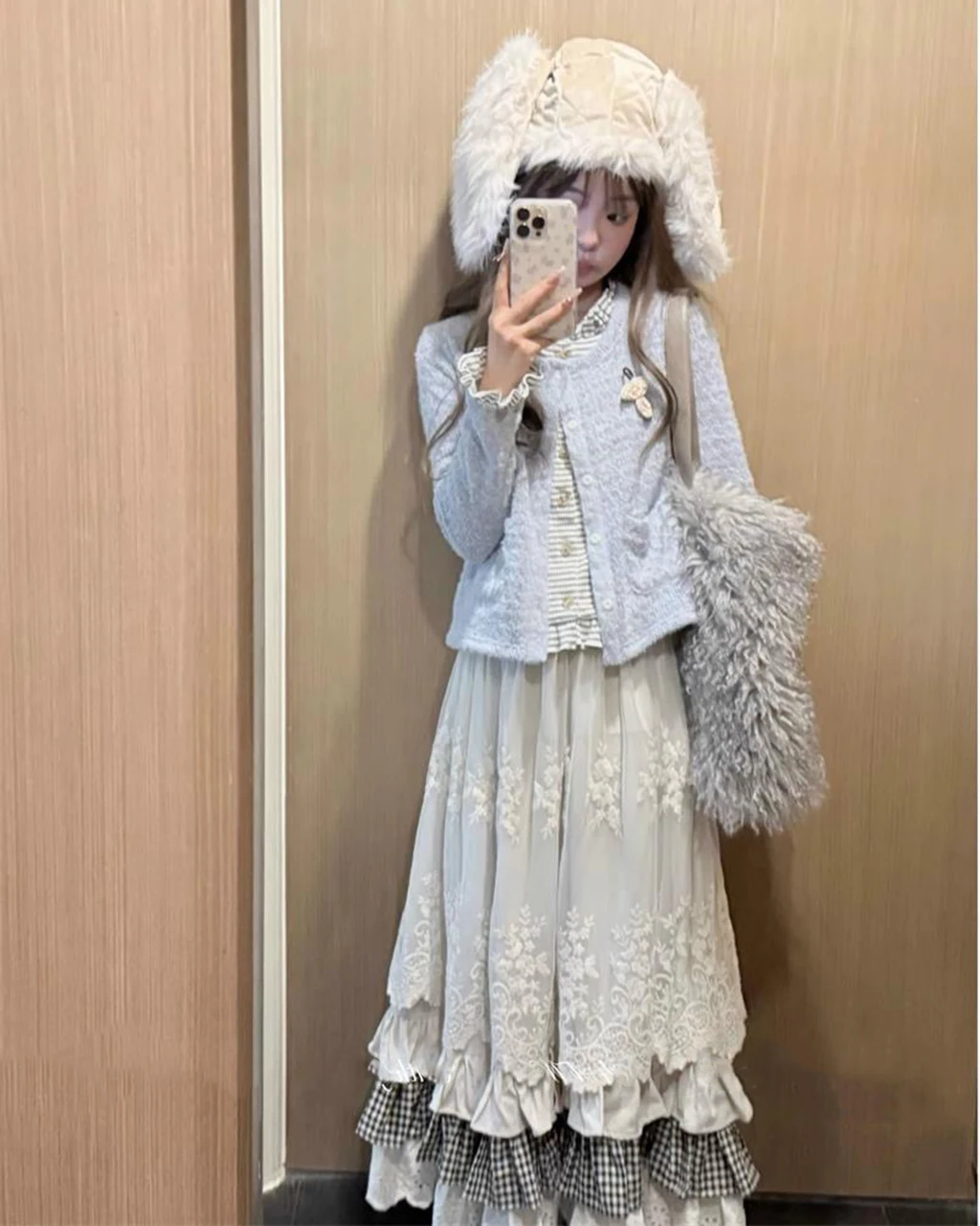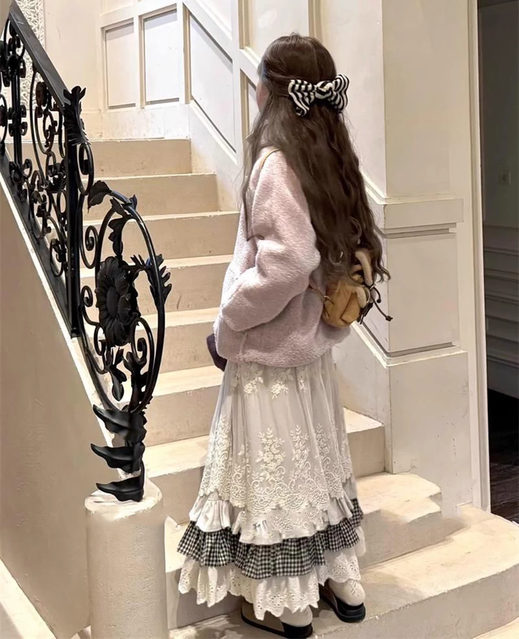 The skirt is made of skin-friendly lace fabric, which has a soft and delicate touch. It won’t cause any stinging sensation even when worn in winter. The checkered fabric of the skirt hem is made of crisp cotton, maintaining a three-dimensional effect in the multi-layer design and making it look more dynamic when walking.