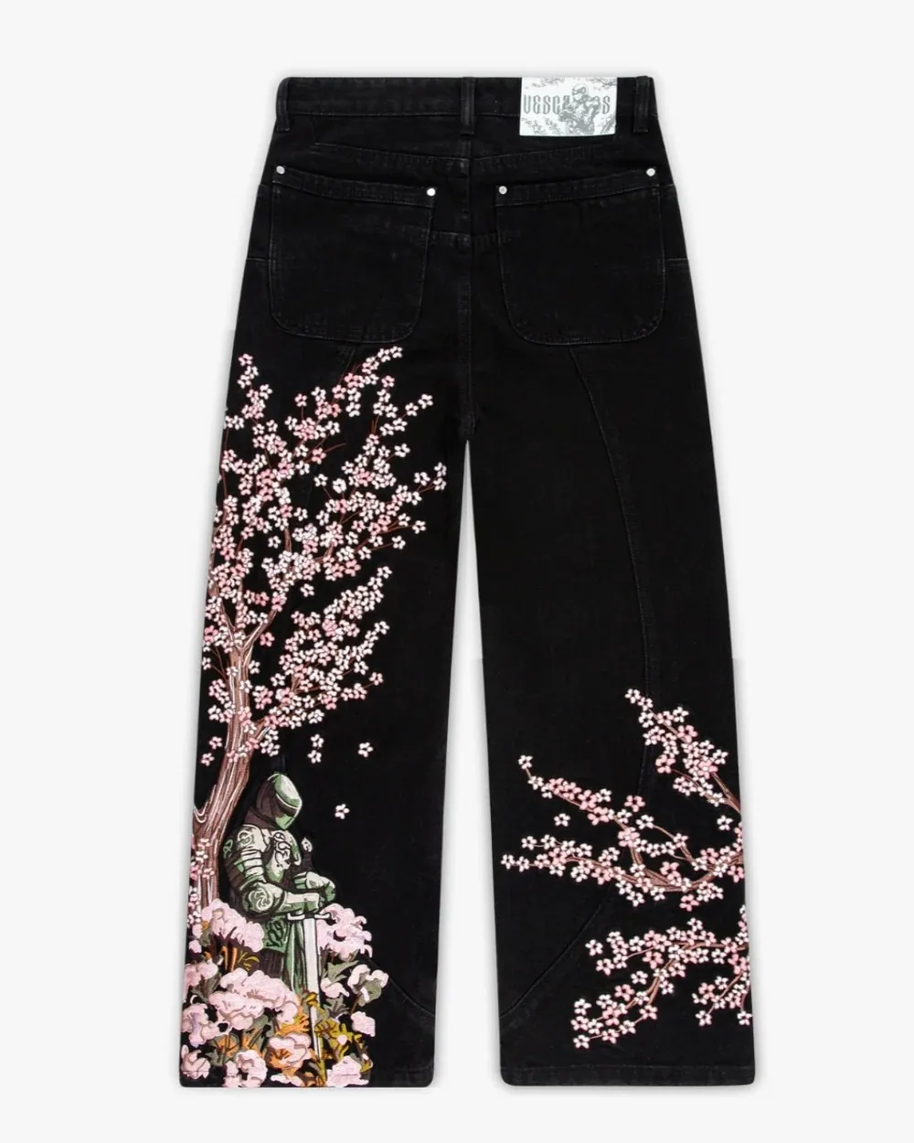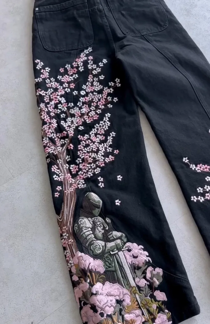 Y2k Vintage Baggy Fallen Knight Cherry Blossom Embroidery Jeans Men Women Fashion Straight Wide-leg Denim Pants Streetwear Jean