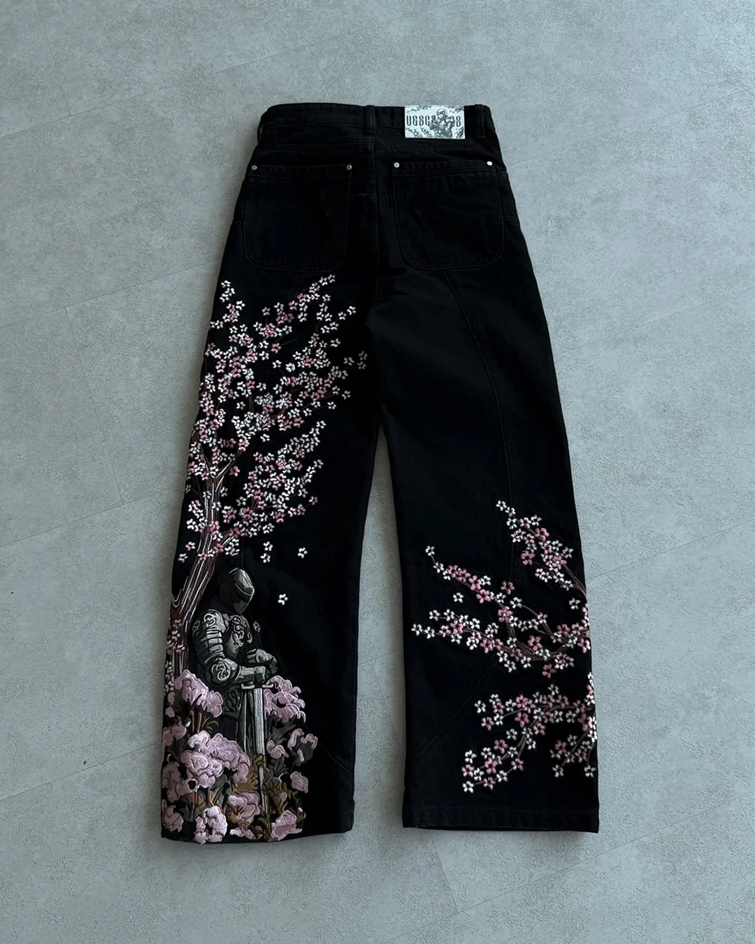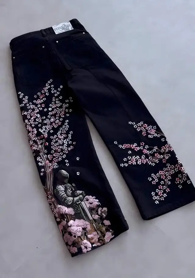 Y2k Vintage Baggy Fallen Knight Cherry Blossom Embroidery Jeans Men Women Fashion Straight Wide-leg Denim Pants Streetwear Jean